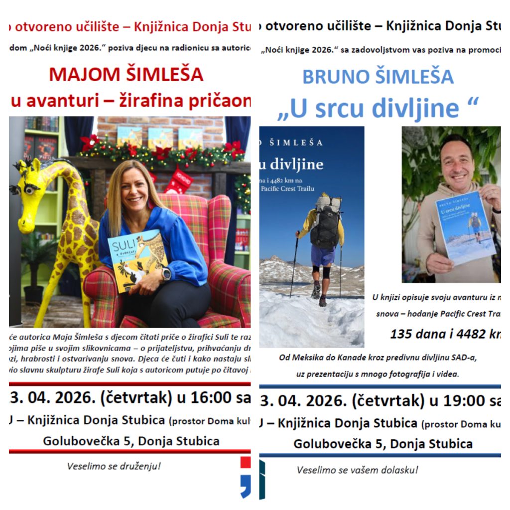 Pred nama je Noć knjige, jedna od najprepoznatljivijih i najmasovnijih domaćih kulturnih manifestacija posvećenih knjizi i čitanju koja se održava u povodu Svjetskog dana knjige i autorskih prava te Dana hrvatske knjige. Tim su povodom brojne zagorske knjižnice i druge kulturne ustanove pripremile prigodni program. Pučko otvoreno učilište – Knjižnica Donja Stubica za večeras organizira promociju knjige „U srcu divljine“ autora Bruna Šimleše. U novoj knjizi „U srcu divljine“ Šimleša opisuje svoju avanturu iz najluđih snova – hodanje Pacific Crest Trailom gdje je u 135 dana prohodao 4482 kilometra od Meksika do Kanade kroz predivnu divljinu SAD-a. Promocija i druženje s Brunom Šimlešom održati će se večeras od 19 sati. Susretu s Brunom Šimlešom prethodit će dječja radionica i druženje s Majom Šimlešom koja će s djecom čitati priče o žirafici Suli i pričati o prijateljstvu, prihvaćanju drugačijih, o vrlinama, slozi, hrabrosti i ostvarivanju snova. Radionica počinje u 16 sati, a oba događaja organizirana su u prostoru Knjižnice u Domu kulture