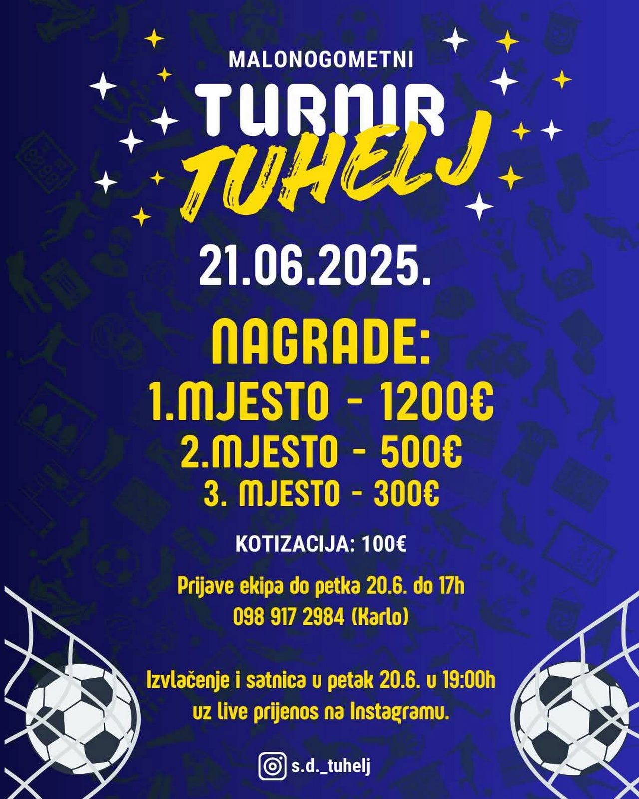 Športsko društvo Tuhelj organizira malonogometni turnir koji će se održati sutra (u subotu) na igralištu kod Osnovne škole Lijepa naša u Tuhlju. Prijave se primaju do danas do 17 sati na broj 098 917 29 84. Izvlačenje parova je od 19 sati.