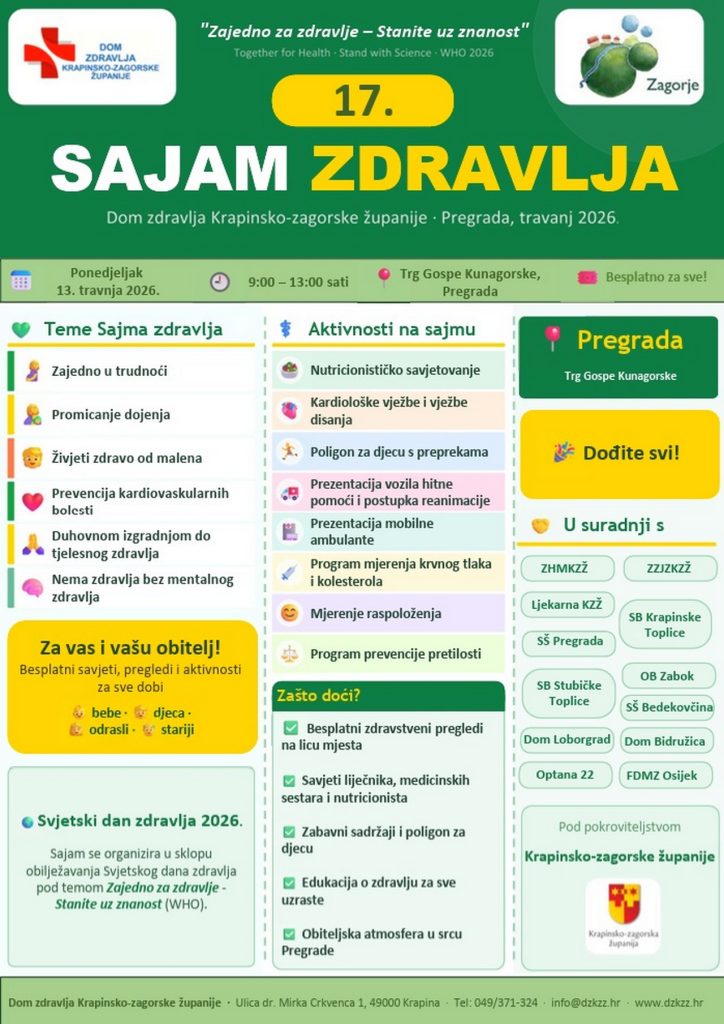 S ciljem promicanja zdravlja i podizanja kvalitete života, a povodom Svjetskog dana zdravlja, koji se obilježava 7. travnja, u ponedjeljak će se održati tradicionalni, 17. Sajam zdravlja Krapinsko-zagorske županije. Domaćin je Pregrada, a program će se na Trgu Gospe Kunagorske odvijati od 9 do 13 sati. Sajam organiziraju patronažne sestre Doma zdravlja Krapinsko-zagorske županije, a ove godine tri su izdvojene teme. Tu su Kutak za mame i bebe – trudnoća i dojenje, Preventivni kutak – živjeti zdravo od malena i prevencija kardiovaskularnih bolesti te Kutak za dušu i tijelo – duhovnom izgradnjom do tjelesnog zdravlja. Pored Doma zdravlja, sudjeluju i županijski Zavod za javno zdravstvo i Zavod za hitnu medicinu, Ljekarna KZŽ, specijalne bolnice Krapinske i Stubičke Toplice, Opća bolnica Zabok i bolnica hrvatskih veterana, srednje škole Bedekovčina i Pregrada, domovi Loborgrad i Bidružica, Fakultet za dentalnu medicinu i zdravstvo Osijek – studij sestrinstva i Optika Ana. Događaju će se pridružiti i djeca iz Dječjeg vrtića Pregrada.