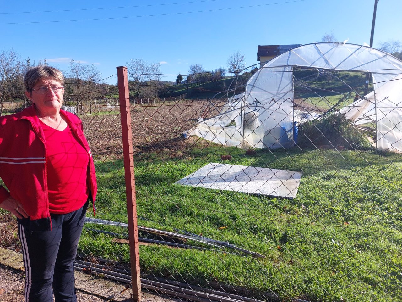 U to vrijeme bio je kući, kaže da se čula tutnjava, provirio je van, skoro ga bacilo na pod. I kod njega su majstori i saniraju se posljedice štete. Susjedi Višnji Vajdić vjetar je razbio crjepove na kući i garaži, ali ju je najviše pogodilo što joj je uništen plastenik. „Plastenik je skroz potrgan, povrće uništeno. Unutra je bilo još paprike, paradajza, posijane salate… Zvala sam da pitam koliko košta plastenik, rekli su mi 3,5 tisuće eura”, sa suzama nam je ispričala gospođa Vajdić.