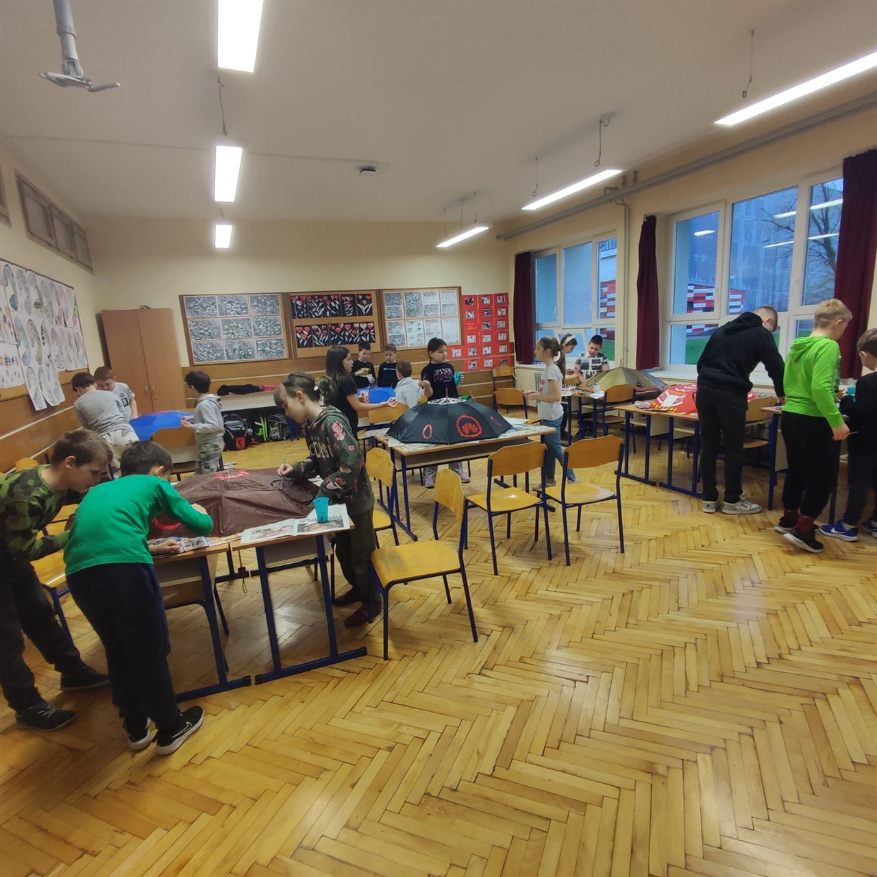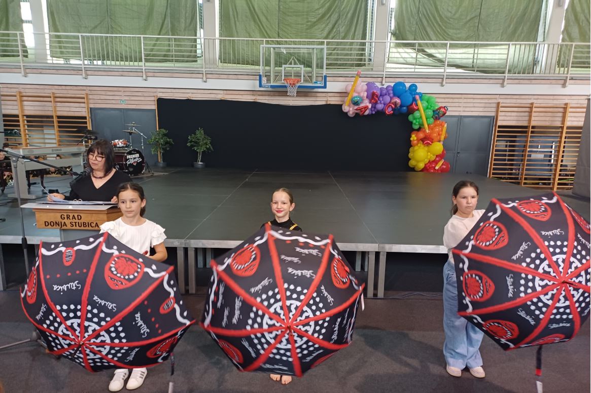 Takav „otpad” bili su i stari kišobrani koje su djeca donijela u školu i tijekom netom završene školske godine oslikavali ih motivima specifičnim za oslikavanje tradicijskih drvenih igračaka. „Razred smo uredili tako da su nam kišobrani bili kao gljive sred stolova, a djeca su ih oslikavala tim crticama i spajala kojekakvim elementima…, bilo je bitno da postignu ritam. Boju smo prilagodili podlozi koju smo imali i tako je nastalo 10 ili 11 prekrasni ambrela od kojih je svaka pričala priču na svoj način”, ispričala je Štefek Borovčak,